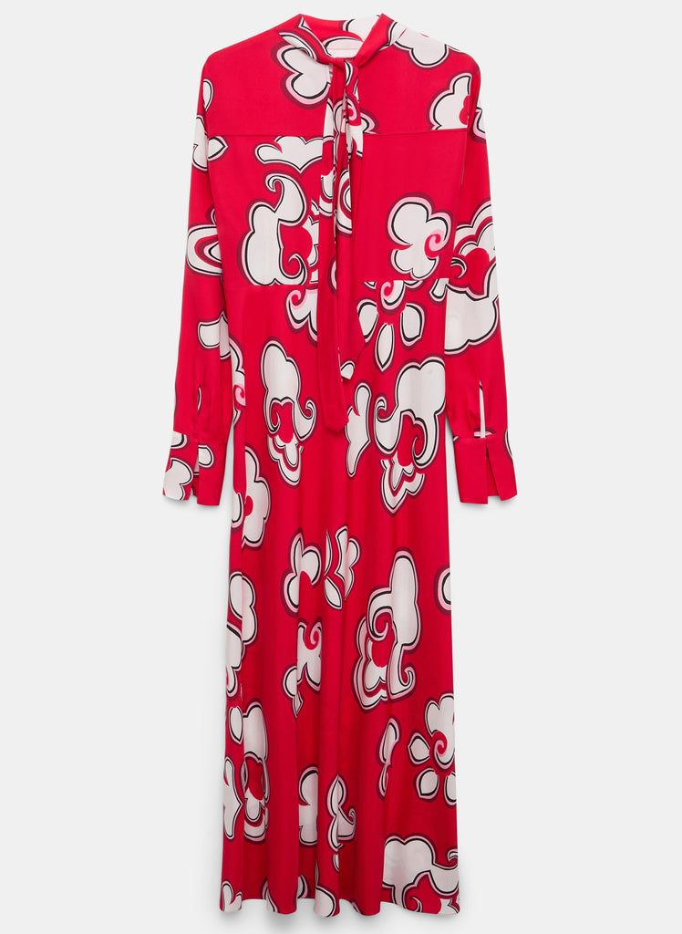 The cherry on top: Das Viskose-Twillkleid in leuchtendem Rot ist mit unserem hauseigenen Signature-Print verziert. Die längere Silhouette hat einen Schalkragen, der im Rücken gebunden wird.