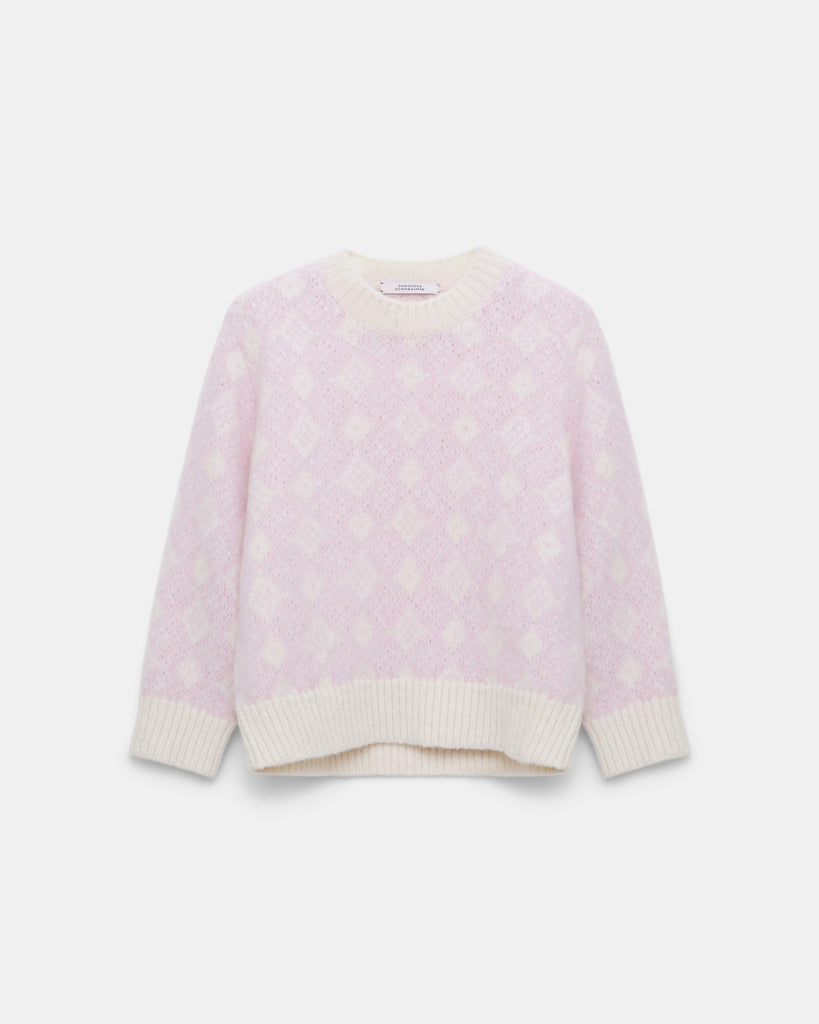 Der Pullover ist aus einem weichen Alpaka-Mix gefertigt und zeigt sich mit einem grafischen Jacquard-Muster. Das Modell hat einen Rundhalsausschnitt, weite Ärmel mit anliegenden Bündchen und einen kurzen, entspannten Fit.