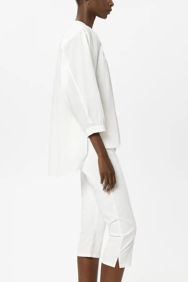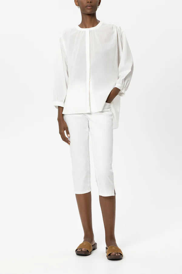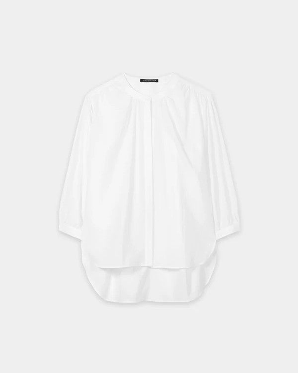 Hemdbluse aus Baumwollvoile mit Rundhalsausschnitt, verdeckter Knopfleiste und angekrauster Schulter- und Rückenpartie. Die Rückseite ist länger geschnitten und hat einen abgerundeten Saum. Die betont volumigen Ärmel schließen mit einer Ein-Knopf-Manschette ab.