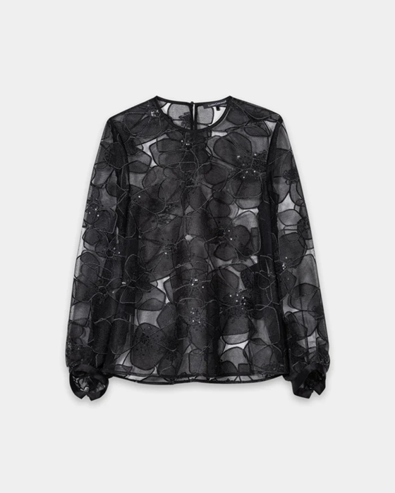 Bluse aus zartem, durchscheinendem Tüll mit femininer Blütenstruktur und aufgestickten Pailletten. Die voluminösen Ärmel schließen mit einem Satinbündchen und stoffüberzogenem Knopf ab. Im Nacken befindet sich ein dezent glitzernder Schmuckknopf.