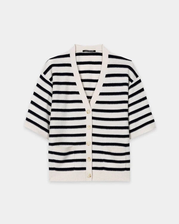 Kurzärmliger, gestreifter Cardigan aus edler Kaschmir-Mischung mit V-Ausschnitt, French Shoulder und durchgehender Knopfleiste. Auf der Vorderseite sind zwei kleine Taschen aufgesetzt.